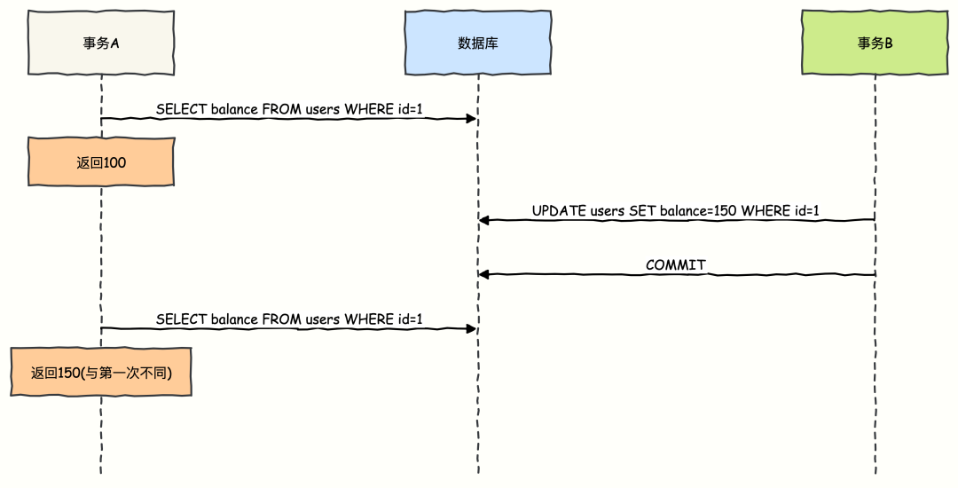 事务 A 第一次读取账户余额为 100 元。此时事务 B 提交了修改,将余额更新为 150 元。事务 A 再次读取余额,得到了 150 元。两次读取结果不一致。幻读 (Phantom Read)