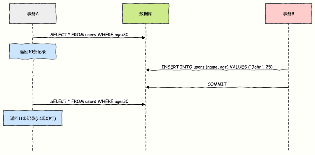 事务 A 第一次查询年龄小于 30 岁的员工,返回了 10 条记录。此时事务 B 提交了一个新操作,插入了一名 25 岁的员工记录。事务 A 再次执行相同的查询,返回了 11 条记录。不可重复读 vs 幻读: