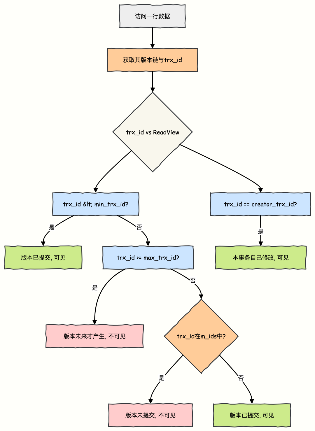 如果数据版本的trx_id < min_trx_id,说明该版本在 ReadView 创建前已提交,可见。如果数据版本的trx_id >= max_trx_id,说明该版本在 ReadView 创建后才开启,不可见。如果min_trx_id <= trx_id < max_trx_id,则需判断trx_id是否在m_ids中:如果在,说明创建 ReadView 时该事务仍活跃,其修改未提交,不可见。
