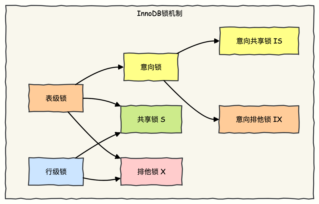 共享锁 (S Lock): 允许事务读一行数据。其他事务可以同时获取共享锁,但不能获取排他锁。排他锁 (X Lock): 允许事务更新或删除一行数据。其他事务无法获取该行的任何锁。此外,InnoDB 还引入了意向锁(Intention Locks),是一种表级锁,用来表示事务稍后会对表中的某一行加上哪种类型的锁(共享或排他)。目的是为了更高效地判断表级锁冲突。