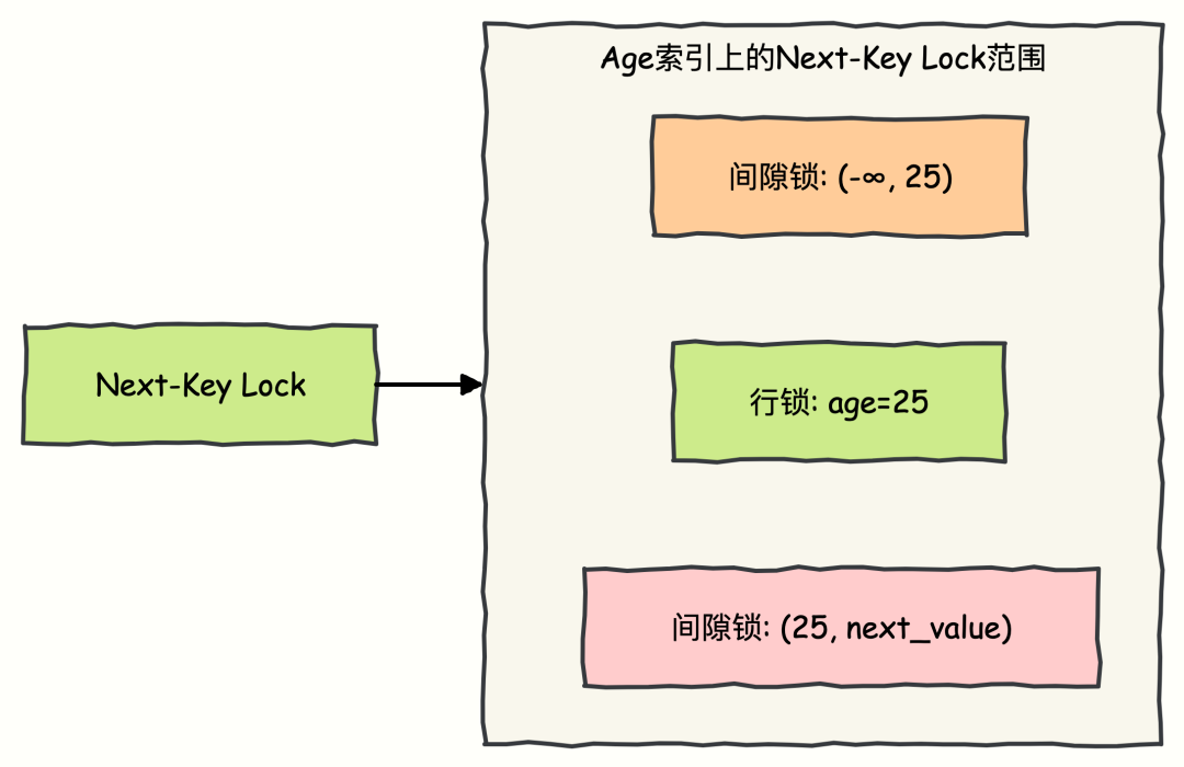 事务 A:SELECT * FROM employees WHERE age = 25 FOR UPDATE; (当前读,加锁)事务 B:INSERT INTO employees (age) VALUES (25); (被阻塞)Next-Key 锁是 InnoDB 在可重复读隔离级别下避免幻读的关键技术,它是记录锁(Record Lock)和间隙锁(Gap Lock)的组合。