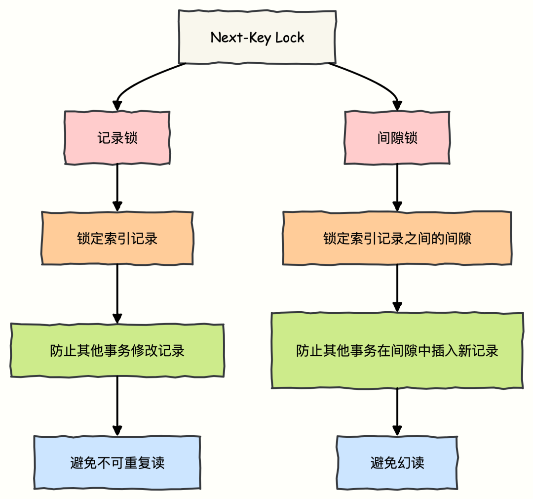Next-Key Lock: 是行锁(Record Lock) 和间隙锁(Gap Lock) 的结合。它锁住的不仅是一个记录,还包括该记录之前的间隙,防止其他事务在这个范围内插入新数据。实现特点: