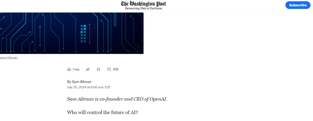 7月25日,奥特曼在《华盛顿邮报》发布了一篇长文《谁将控制AI的未来》。
