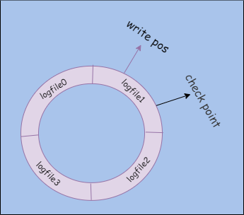 Redo Log 采用固定大小的文件组,比如下图文件组配置了 4 个文件,每个文件大小相同,写满一个后接着写下一个,全部写满后就清除一部分前面的日志,继续写入。write pos 控制当前写入的位置,check point 控制可以写入的最后位置,如果两个点重合了,那就需要清除部分日志,让 check point 后移。