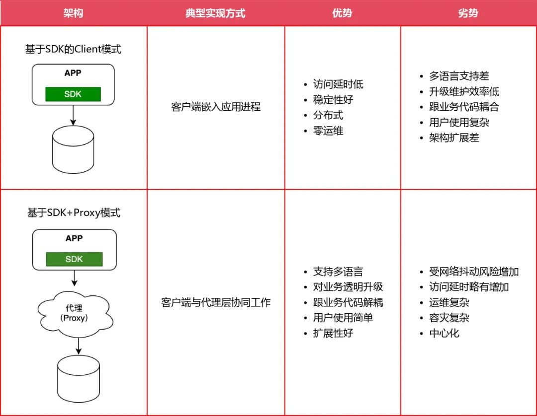 基于 SDK 的方式在早期比较流行,随着 SDK + Proxy 的诞生,目前各大公司已在逐步升级替换,但部分长尾业务依然使用 SDK 的访问形式。从趋势看,基于 SDK + Proxy 的访问方式将会是未来的终态。