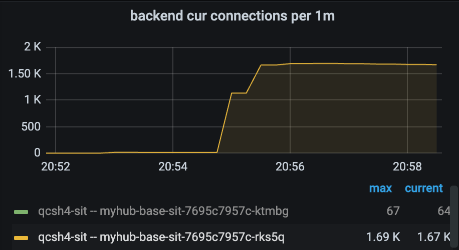 随着洪峰流量达到,MyHub 的后端连接数快速飙升到了1600+,直到达到 MySQL 配置的连接数上限,此时如果 MySQL 配置不足以应对这些连接开销,将会被直接打挂。