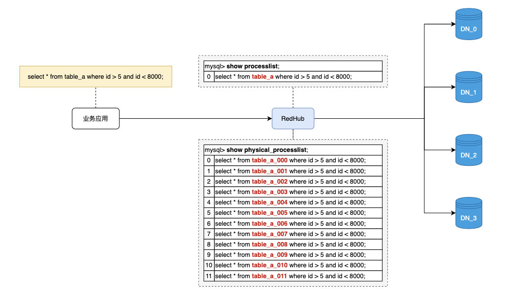 具备逻辑 processlist 管理能力RedHub 层可以直接通过 show processlist 和 show physical_processlist 命令来分别获取当前正在执行的逻辑查询和物理查询,并且支持直接kill对应的查询,尤其是 kill 逻辑查询时,能够自动把关联的底层所有物理查询一并 kill 掉,大大简化运维工作量,时效提升明显