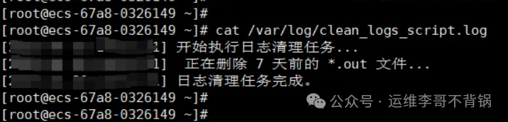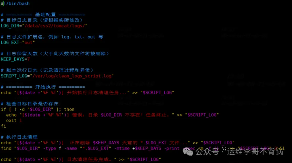 echo"[$(date +%F %T)] 日志清理任务完成。" >> "$SCRIPT_LOG"1.2.3.4.5.6.7.8.9.10.11.12.13.14.15.16.17.18.19.20.21.22.23.24.25.26.27.28.29.