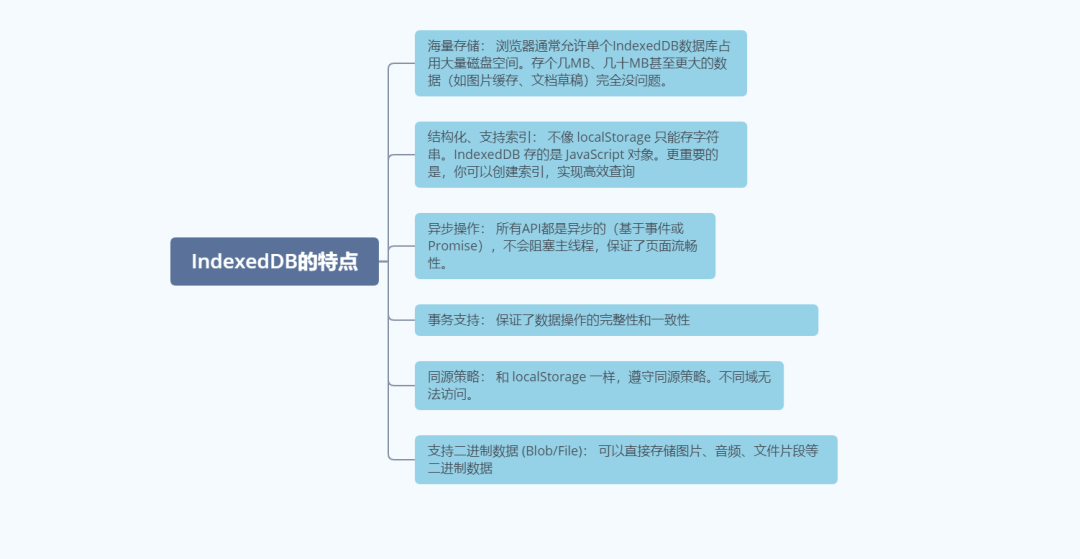 海量存储: 浏览器通常允许单个IndexedDB数据库占用大量磁盘空间。存个几MB、几十MB甚至更大的数据(如图片缓存、文档草稿)完全没问题。