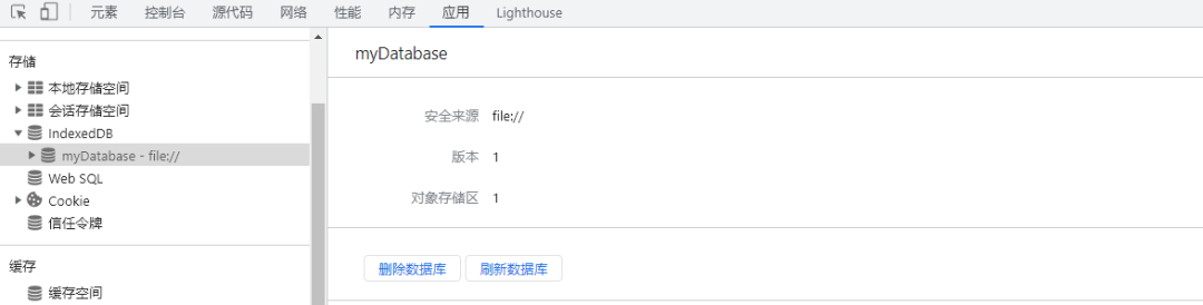 删除整个数据库: 直接在 应用-> 删除数据库 里勾选 IndexedDB 进行清除。