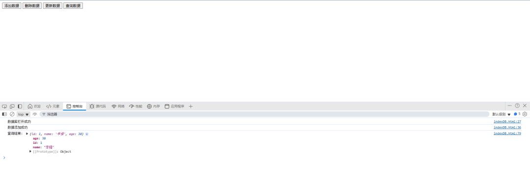 <!DOCTYPE html><html lang="en"><head> <meta charset="UTF-8"> <meta name="viewport" content="width=device-width, initial-scale=1.0"> <title>IndexedDB 增删改查示例</title></head><body> <button id="addBtn">添加数据</button> <button id="deleteBtn">删除数据</button> <button id="updateBtn">更新数据</button> <button id="queryBtn">查询数据</button> <script> // 打开或创建数据库 const request = indexedDB.open(myDatabase, 1); // 数据库打开失败 request.onerror = function (event) { console.error(数据库打开失败:, event.target.errorCode); }; // 数据库打开成功 request.onsuccess = function (event) { const db = event.target.result; console.log(数据库打开成功); // 添加数据 document.getElementById(addBtn).addEventListener(click, function () { const transaction = db.transaction([myObjectStore], readwrite); const objectStore = transaction.objectStore(myObjectStore); const data = { id: 1, name: 李强, age: 30 }; const addRequest = objectStore.add(data); addRequest.onsuccess = function () { console.log(数据添加成功); }; addRequest.onerror = function (event) { console.error(数据添加失败:, event.target.errorCode); }; }); // 删除数据 document.getElementById(deleteBtn).addEventListener(click, function () { const transaction = db.transaction([myObjectStore], readwrite); const objectStore = transaction.objectStore(myObjectStore); const deleteRequest = objectStore.delete(1); deleteRequest.onsuccess = function () { console.log(数据删除成功); }; deleteRequest.onerror = function (event) { console.error(数据删除失败:, event.target.errorCode); }; }); // 更新数据 document.getElementById(updateBtn).addEventListener(click, function () { const transaction = db.transaction([myObjectStore], readwrite); const objectStore = transaction.objectStore(myObjectStore); const data = { id: 1, name: Jane, age: 30 }; const putRequest = objectStore.put(data); putRequest.onsuccess = function () { console.log(数据更新成功); }; putRequest.onerror = function (event) { console.error(数据更新失败:, event.target.errorCode); }; }); // 查询数据 document.getElementById(queryBtn).addEventListener(click, function () { const transaction = db.transaction([myObjectStore], readonly); const objectStore = transaction.objectStore(myObjectStore); const getRequest = objectStore.get(1); getRequest.onsuccess = function (event) { const result = event.target.result; if (result) { console.log(查询结果:, result); } else { console.log(未找到数据); } }; getRequest.onerror = function (event) { console.error(数据查询失败:, event.target.errorCode); }; }); }; // 数据库版本更新时创建对象仓库和索引 request.onupgradeneeded = function (event) { const db = event.target.result; if (!db.objectStoreNames.contains(myObjectStore)) { const objectStore = db.createObjectStore(myObjectStore, { keyPath: id }); objectStore.createIndex(name, name, { unique: false }); objectStore.createIndex(age, age, { unique: false }); } }; </script></body></html>