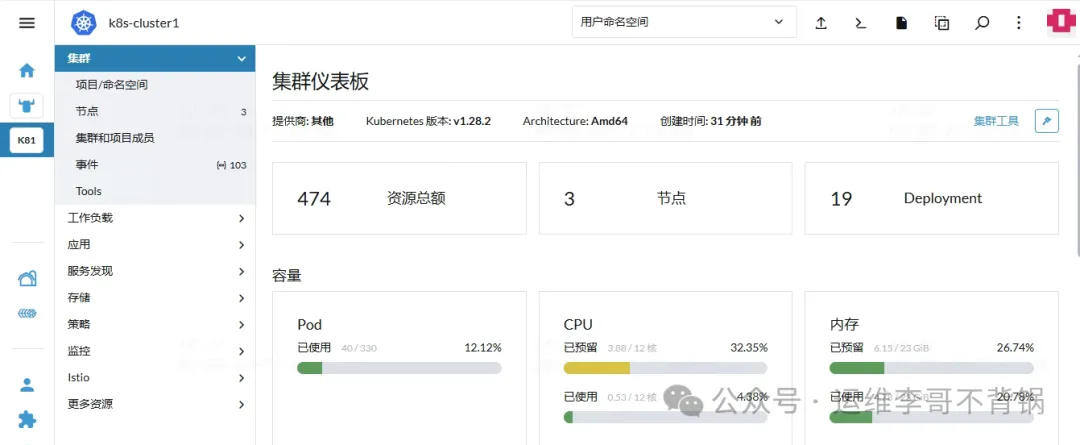 至此,已经对接完成,后续可以在Rancher上监控Kubernetes集群的状态,并且可以直接通过图形化创建工作负载,简化了配置过程。