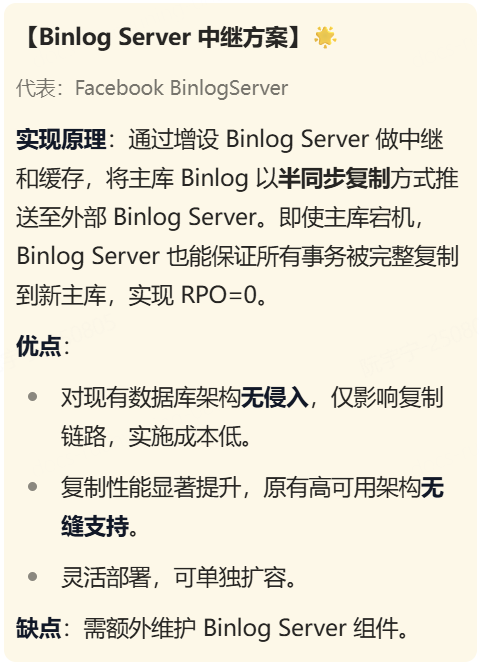 基于方案复杂性和稳定性考虑,我们对比后决定采用 Binlog Server 方案,来实现小红书 MySQL 的 RPO=0,并满足以下条件: