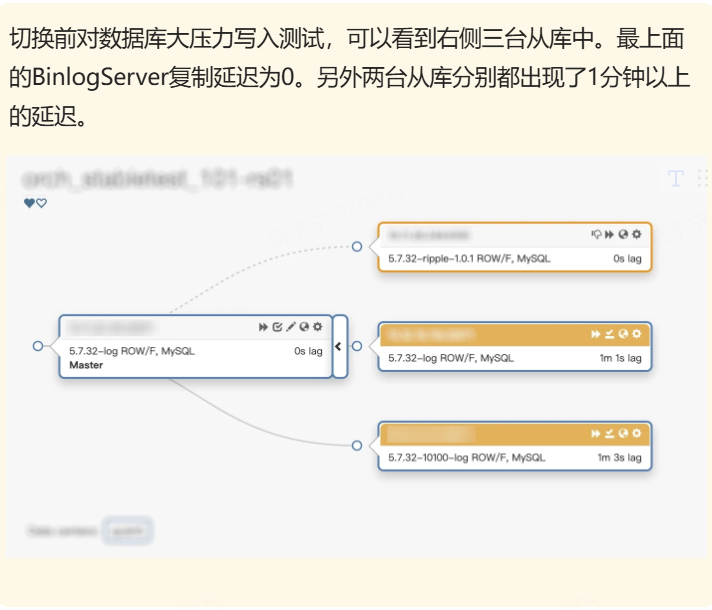 得益于Binlog Server性能的提升,当出现写入大压力的场景时,Binlog Server可以跟上主库写入速度,并且在故障场景下为新主库提供日志数据。