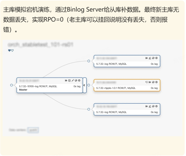 得益于 Binlog Server 的高吞吐能力,以及半同步复制特性,可以确保 Binlog Server 中的数据始终保持最新。即使遇到如机房断网等严重故障场景,结合 ORC 的选主策略,可以实现 MySQL 故障切换过程中数据 0 丢失。
