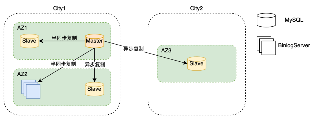当前线上采用了同城异可用区 Binlog Server 部署形式,也就是在 MySQL 集群内部署一个同城、不同机房、半同步连接的 Binlog Server 实例,如下图所示: