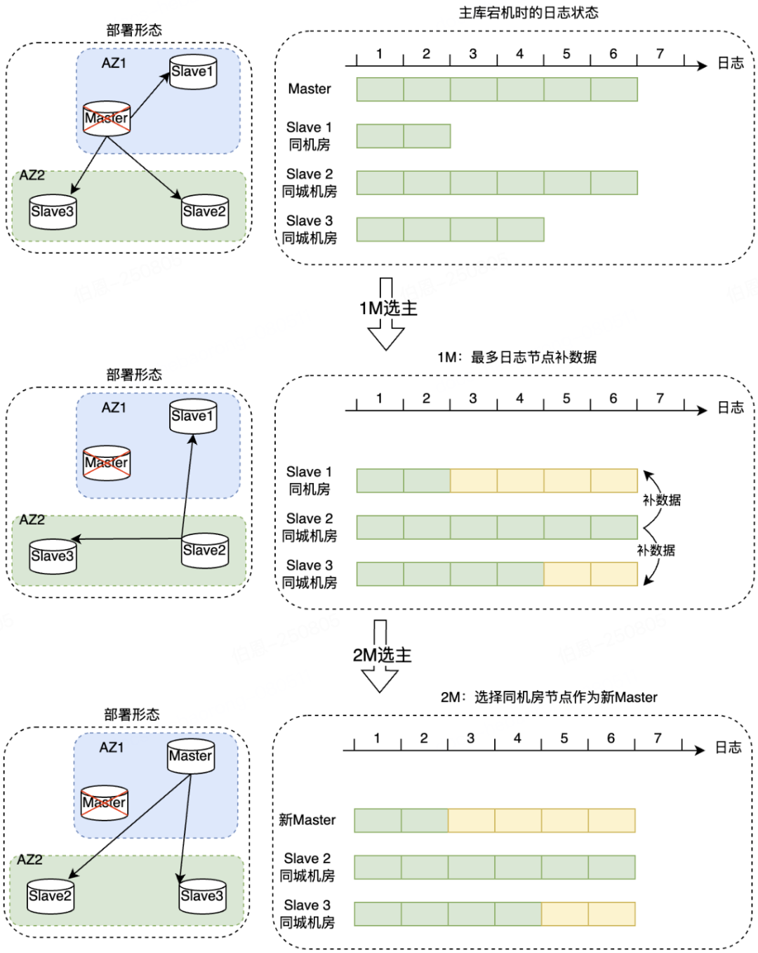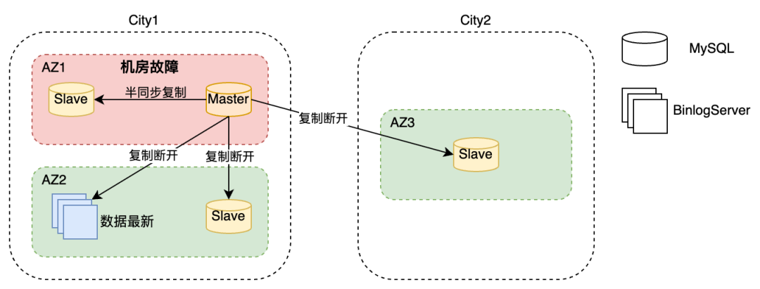 当主库宕机时,希望最终选举出来一个同机房的新主库为业务提供服务。但是同机房的从库不一定是数据最多的从库。因此需要增加补数据的环节,如下图所示。