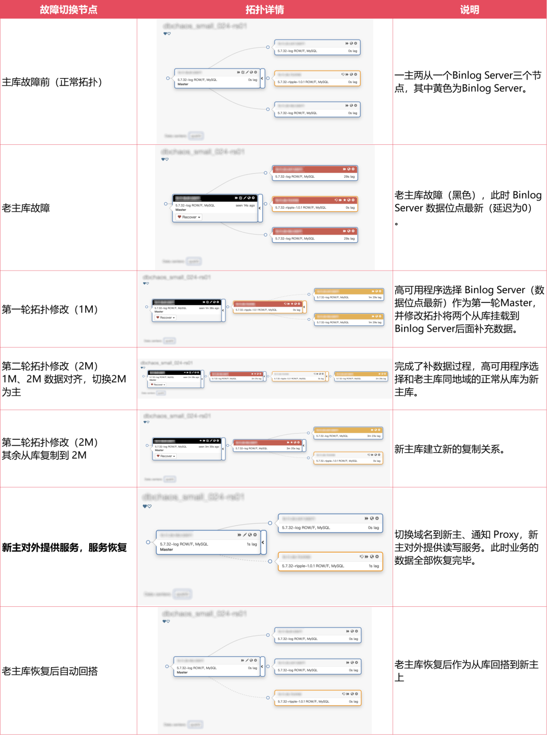 2)优化了故障切换效率,按照一致性优先原则使用Binlog Server为新主库补数据,有效降低运维成本和业务风险,实现数据库快速数据恢复。