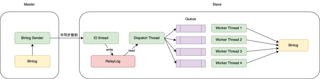 首先关注一下影响主从延迟的原因。下图是MySQL主从复制的完整的数据链路图。绿色框表示执行线程,黄色框表示实例(主库/从库)的Binlog,因为Binlog Event中带有时间戳,所以主从延迟表示为从库的Binlog时间 - 主库的Binlog时间。红色的框为Relaylog,可以理解为从库来不及处理的数据的临时在磁盘存储的文件。紫色为每个worker thread对应的处理队列(内存结构)。