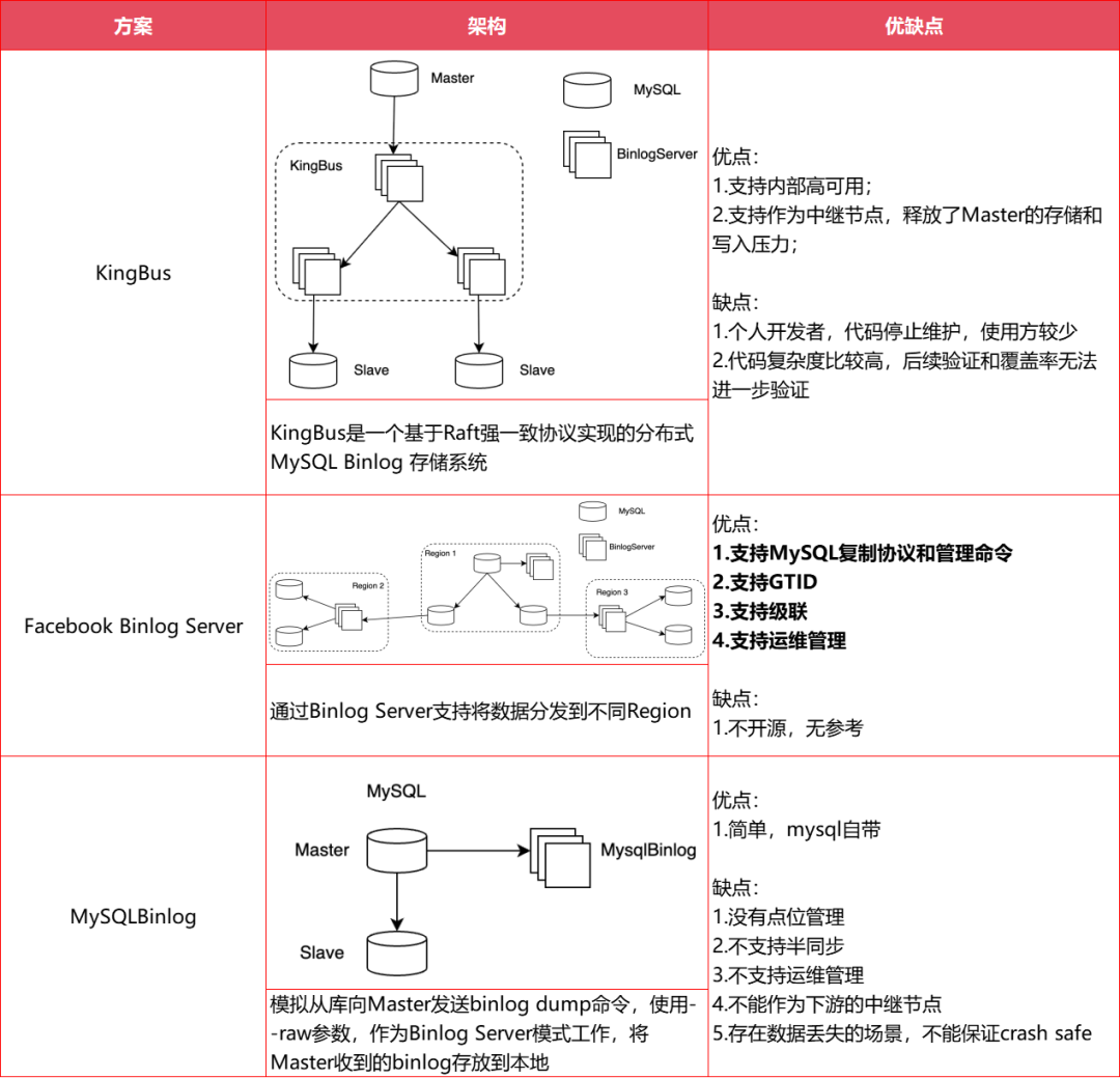 在MySQL不满足需求的情况下,参考调研市场上已有的Binlog Server,总结各个方案的优缺点。