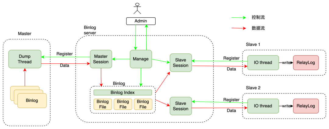 Binlog Server架构与其基本数据流和控制流基本如下图所示。下图所示为级联架构(对Binlog Server来说最复杂的场景),同时支持Master和Slave分别作为上下游,表现类似一个MySQL实例。其中绿色线表示Binlog Server控制流,主要是从Admin管理员发送的管控SQL,在SQL解析器处理后,在Manage模块进行处理,可以对MasterSession(和主库的连接),SlaveSession(和下游从库的连接),Binlog(本地存储文件)进行管理。红色线就是数据流,主要是存放主库发送来的Binlog数据,存储在本地并通过SlaveSession向下游发送。具体模块将一一展开介绍。