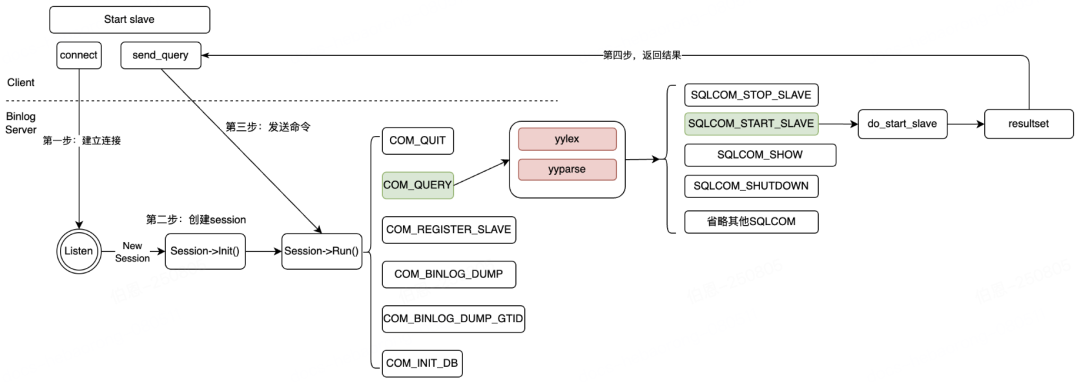 语法解析阶段SQL命令执行阶段SQL结果输出阶段支持 start slave 和 stop slave 等运维命令,保持slave的启停方式和MySQL一致。以start salve为例,下面展示了 SQL 解析和执行过程,首先会建立一个新 session 和 MySQL 客户端保持联系,然后用户发出 start slave 命令,按照COM_QUERY进行解析。在自定义语法解析器中,将start slave 标记为 SQLCOM_START_SLAVE,然后执行 节点注册过程(详细过程见下一节),最终返回结果集。