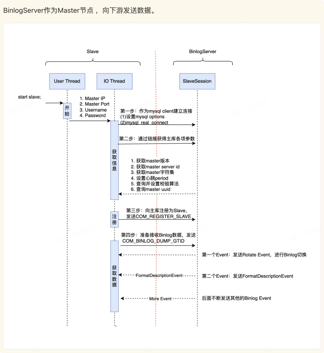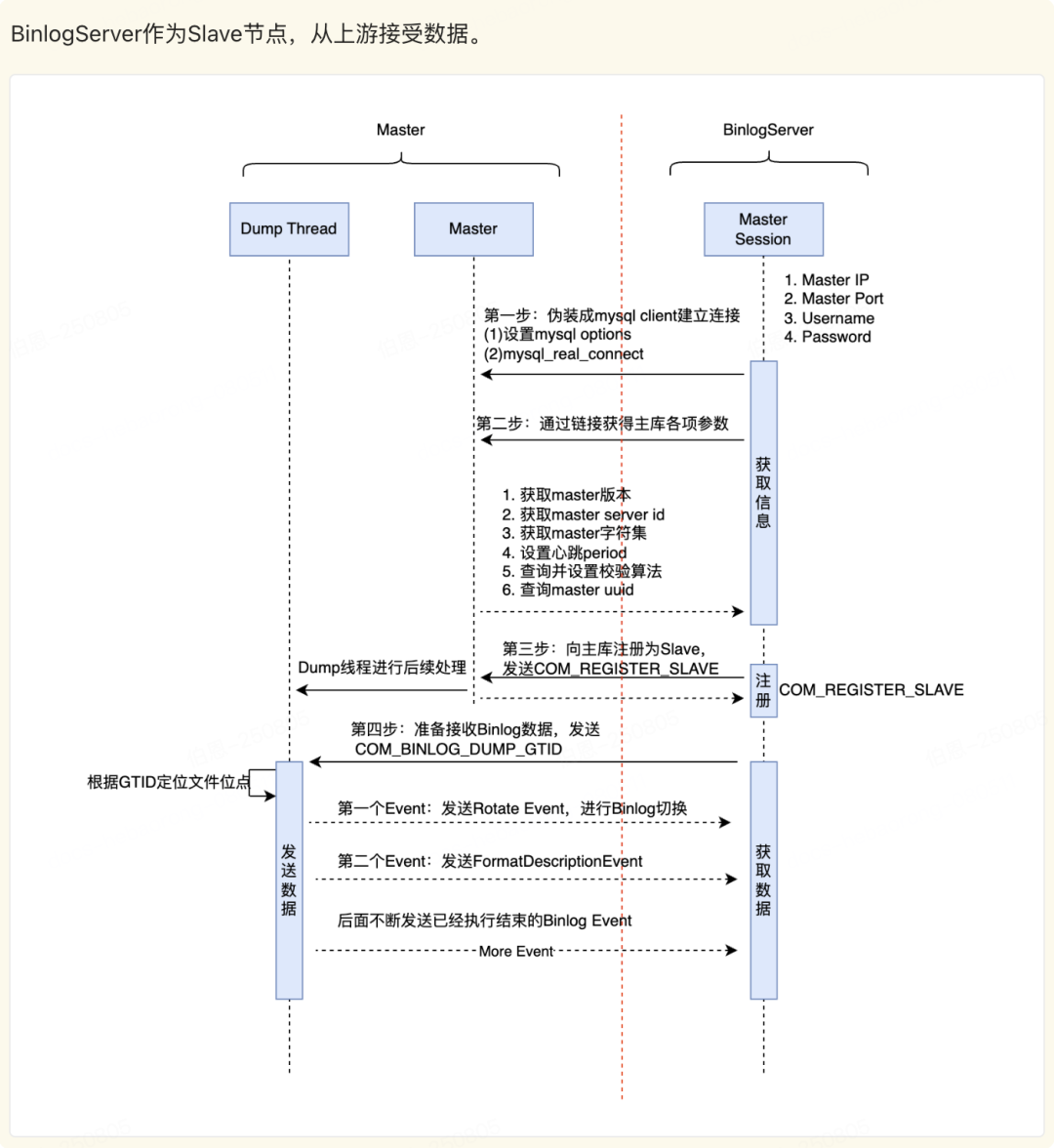 Binlog Server支持级联架构,既可以作为Slave节点从上游接收并保存Binlog,也可以作为Master向下游发送Binlog。因此其必须具有双向注册能力,需要遵守MySQL节点注册的规范,模拟作为从库或者主库进行注册。
