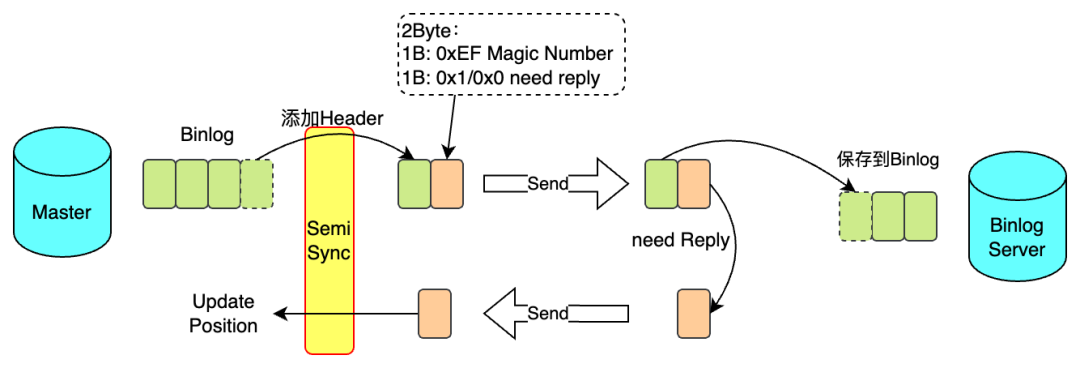 和异步复制相比,半同步发送Binlog过程有变化,这将影响BinlogServer处理的过程。如下图所示,Master节点生成了Binlog文件(由一个个Event构成),在发送Event时,会在每个Event前添加Header。每个Header由2字节构成,第一字节为0xEF(Magic Number)用于校验,第二字节为0x1/0x0,用于指示从库是否发送ACK。当数据发送到BinlogServer以后,会先处理Header信息,确定是否需要发送ACK,如果需要发送,就将MasterLog位点信息发送给主库。主库收到ACK后确认这些数据已经在下游持久化,即可在主库InnoDB进行提交(AFTER_SYNC模式)。