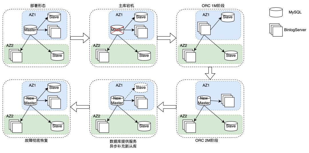 主库故障和恢复流程简化过程上图所示。部署形态上采用Master挂载2个半同步的BinlogServer以保证数据不丢失,Master同时挂载若干个异步复制的Slave节点。