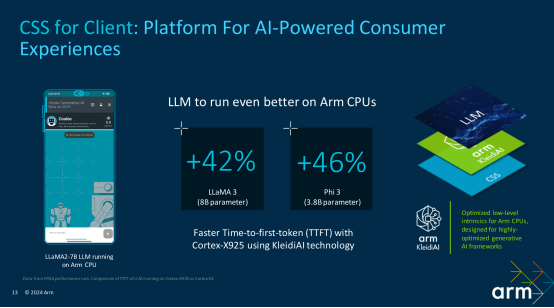 据安谋科技 (Arm China) 开发者生态高级经理李陈鲁介绍,KleidiAI 是一套面向 AI 框架开发者的计算内核,使他们能够在各种设备上轻松获得 Arm CPU 上的最佳性能,并支持 Neon、SVE2 和 SME2 等关键 Arm 架构功能。KleidiAI 与 PyTorch、Tensorflow、MediaPipe 等热门 AI 框架集成,旨在加速 Meta Llama 3、Phi-3 等关键模型的性能,并且还可前后兼容,以确保 Arm 在引入更多技术时依然能适用未来市场的需求。