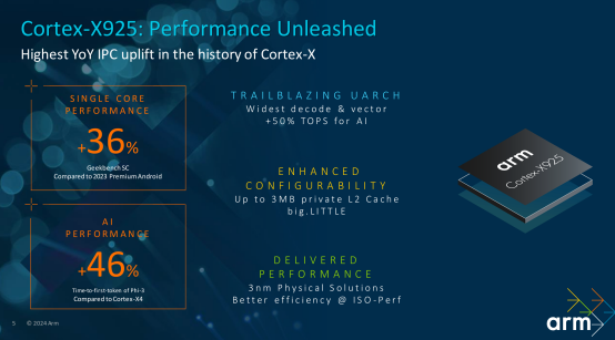 作为目前Arm最强的CPU产品,Cortex-X925 利用了领先的三纳米工艺节点,在 3.8GHz 的时钟速率和最大缓存大小的条件下,与 2023 年旗舰智能手机的四纳米 SoC 相比,其单线程性能大幅提高 36%。而在 AI 性能方面,Cortex-X925 取得了 46% 性能提升,可显著提高如大语言模型 (LLM) 等设备端生成式 AI 的响应能力。