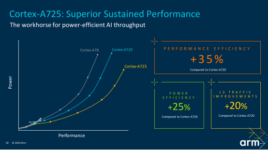 Cortex-A725同样采用了三纳米工艺,与 Cortex-A720 相比,Cortex-A725 的性能效率提升了 35%,能效提升了 25%。 除此之外,作为Arm最新的高效CPU,Arm Cortex-A725还实现了性能与效率的最佳平衡。