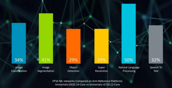 数据显示,与TCS23中的Immortalis-G720相比,Immortalis-G925作为Arm终端CSS的一部分,在关键用例中提供一系列AI性能改进。在图像处理方面(包括分割和分类),Immortalis-G925可实现 41% 的性能提升。同时,在超级采样任务中,开发者可以使用神经网络放大图像,其性能可提高近30%,而在自然语言处理和语音转文本,性能可提高50%,同样十分惊艳。