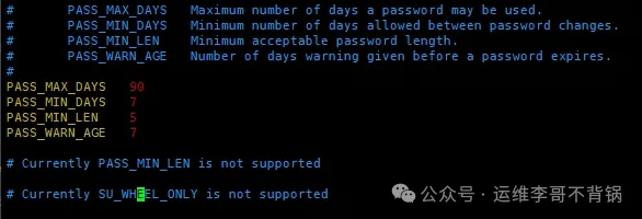 # 修改前备份 cp /etc/login.defs /etc/login.defs.bak # 修改配置 vim /etc/login.defs # 修改下面的内容 PASS_MAX_DAYS 90 # 密码最大过期时间,不大于90则合规 PASS_MIN_DAYS 7 # 口令更改最小间隔天数应大于等于7 PASS_WARN_AGE 7 # 口令过期警告提前天数1.2.3.4.5.6.7.8.9.