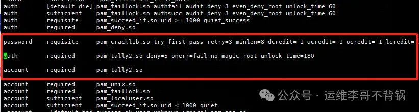 vim /etc/pam.d/system-auth # 增加如下内容:输入错误5次,锁定180s auth required pam_tally2.so deny=5 notallow=fail no_magic_root unlock_time=180 account required pam_tally2.so1.2.3.4.5.6.