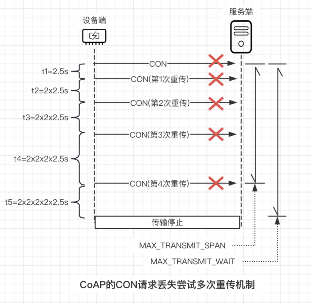 需要注意的是上图只是为了说明重传机制的完整流程,只要CON消息发送后任意时刻,设备端收到来自服务端的ACK/RST消息,本次消息传送便会终止。通过这种重传机制,CoAP协议保证了端到端消息传输的可靠性。