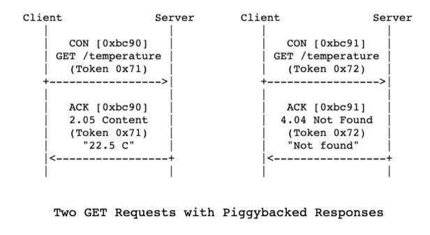 下图[1]中展示了对于两个GET请求,服务端返回附带响应的例子,一个成功,一个导致了4.04(资源未找到)。通过ACK报文回应CON报文,是最通用的类型,属于可靠响应模式。