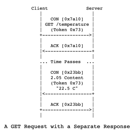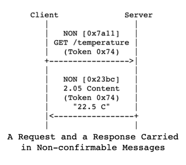 Client的请求如果是NON类型,Server一般也回NON类型消息,但服务器也有可能发送一个CON类型的消息作为响应。适用于对响应可靠性要求不高的场景。例如对温度传感器数据的重复读取,并不需要每一次都成功。图中[1]request和response使用了相同的Token:0x74。