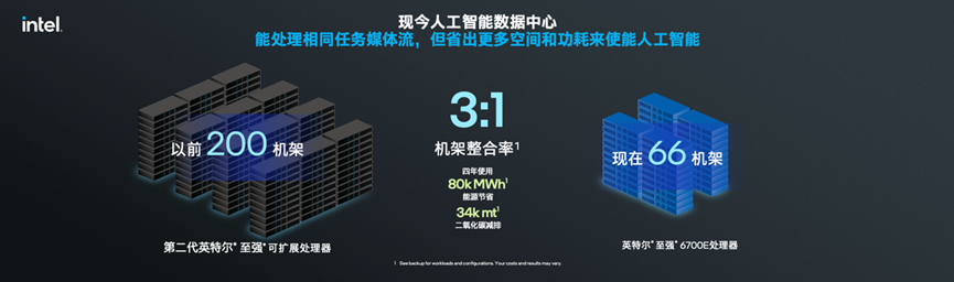 英特尔®️ 至强®️ 6能效核处理器具备高密度内核,极大提升了机架密度——可将200个基于第二代英特尔®️ 至强®️ 处理器的系统机架替换为仅66个,这意味着在更小的空间和更低的功耗条件下,能够处理相同的工作负载。