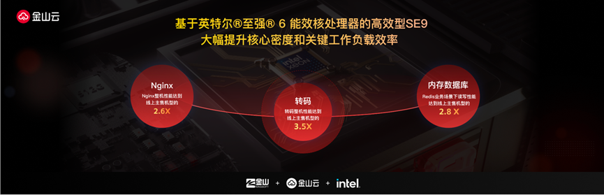 金山云发布第九代云服务器高效型SE9,携手英特尔引领云计算能效新纪元,面向计算、网络和存储方面进行了深度优化,首次支持单实例高达256核vCPU,实现核心密度翻倍。相比线上主售机型,整机整数计算性能提升达3倍,同规格套餐性价比提升超过60%,而Nginx和转码整机性能以及在Redis业务场景下的读写性能,分别实现了最高达2.6倍、3.5倍和2.8倍的提升。