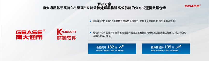 南大通用构建的高效节能分布式逻辑数据仓库,充分利用英特尔®️ 至强®️ 6能效核处理器的多核能力,提升业务部署密度和单节点性能,使Gbase 8a MPP性能提升182%、能效比提升135%,助力绿色可持续数据中心建设。