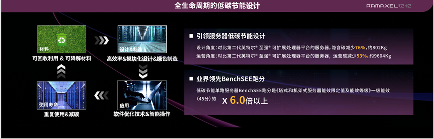 记忆科技推出低碳节能服务器,采用模块化设计,实现了全生命周期的低碳节能设计。与第二代至强平台相比,隐含碳减少76%,运营碳减少53%。其BenchSEE跑分高于《塔式和机架式服务器能效限定值及能效等级》一级能效(45分)的6倍以上。