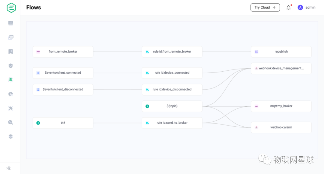 同时,EMQX 5.0 还提供了数据集成可视化查看能力(Flows),通过 Dashboard 页面,您可以清晰地追踪和监控设备与云端之间的物联网数据处理和流转步骤。
