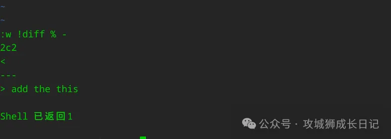 :!<command>是执行shell命令的语法.%表示未修改的当前文件的名称.-是diff命令的STDIN文件。通过上图可以看到文件第二行发生了改变,添加了新的内容。