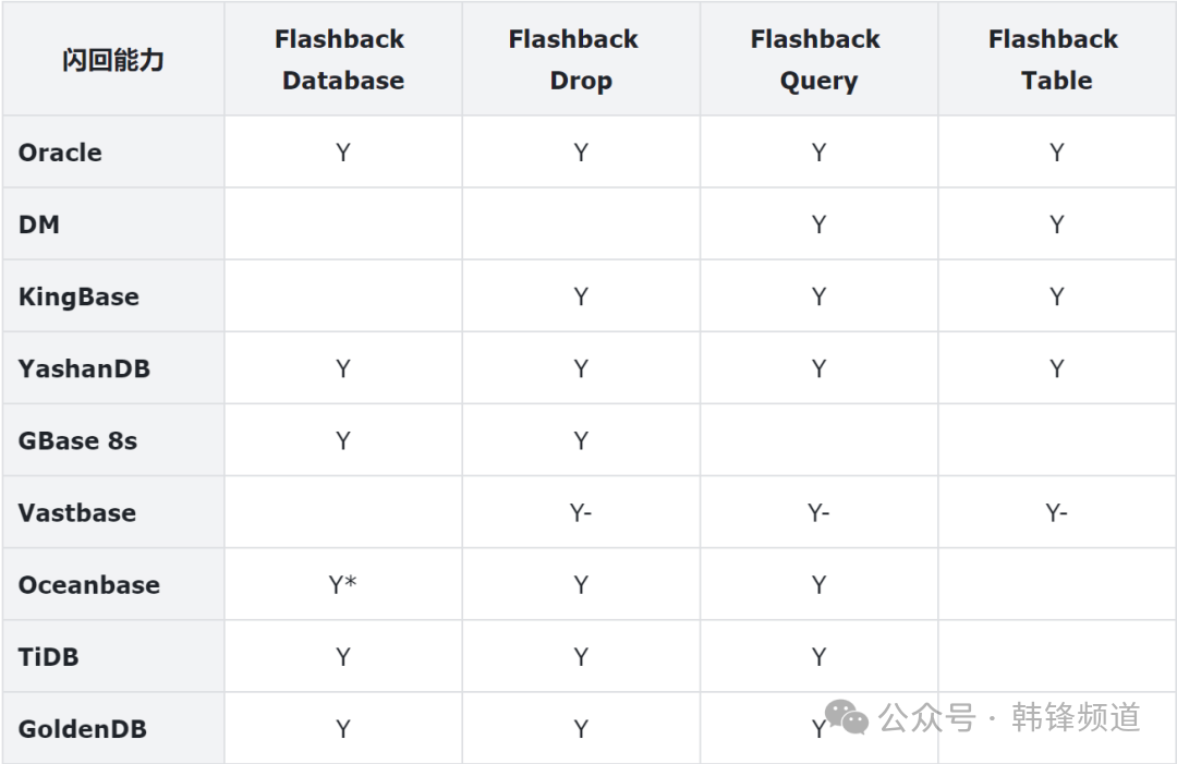 下面整理了主要国产数据库的闪回能力,信息来自各厂商官方文档。其中,Y代表支持,Y*代表有近似实现,Y-代表有限支持。