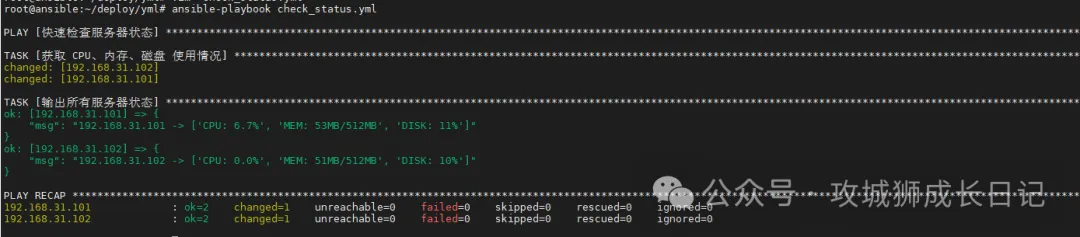 - name:快速检查服务器状态 hosts:all gather_facts:no tasks: -name:获取CPU、内存、磁盘使用情况 shell:| echo "CPU: $(top -bn1 | grep Cpu | awk {print $2"%"})" echo "MEM: $(free -m | awk /Mem/ {print $3"MB/"$2"MB"})" echo "DISK: $(df -h / | awk NR==2 {print $5})" register:server_status -name:输出所有服务器状态 debug: msg: "{{ inventory_hostname }} -> {{ server_status.stdout_lines }}"1.2.3.4.5.6.7.8.9.10.11.12.13.14.