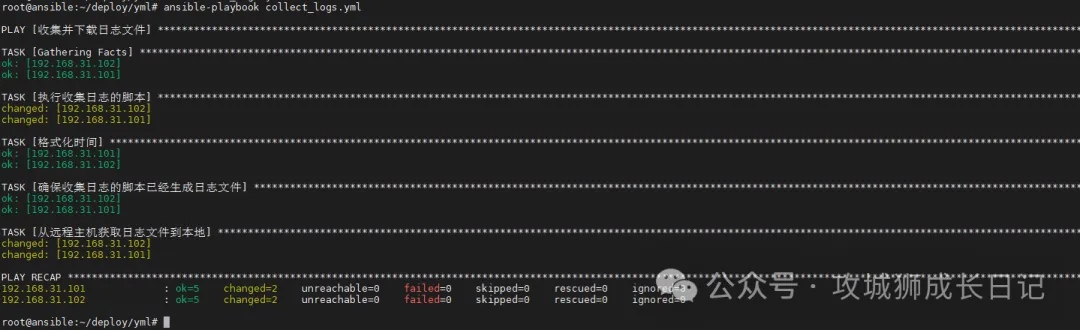 script模块:执行日志收集脚本set_fact模块:设置变量wait_for模块:判断root目录下有没有生成日志文件fetch模块:把生成的日志文件拷贝到本地指定的目录通过ansible-playbook执行如下命令: