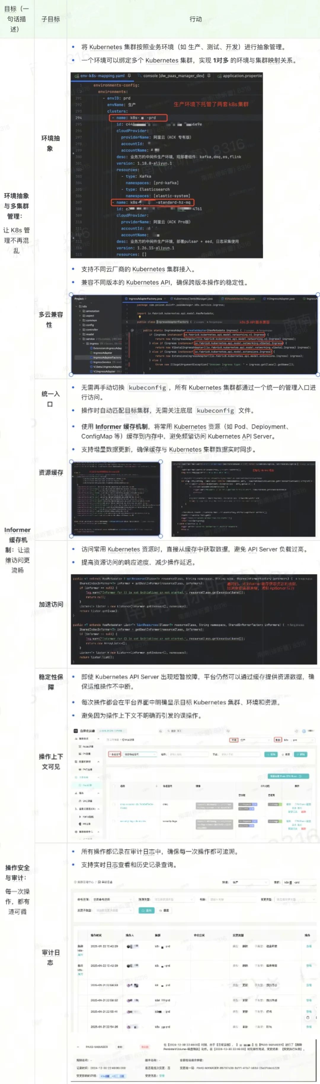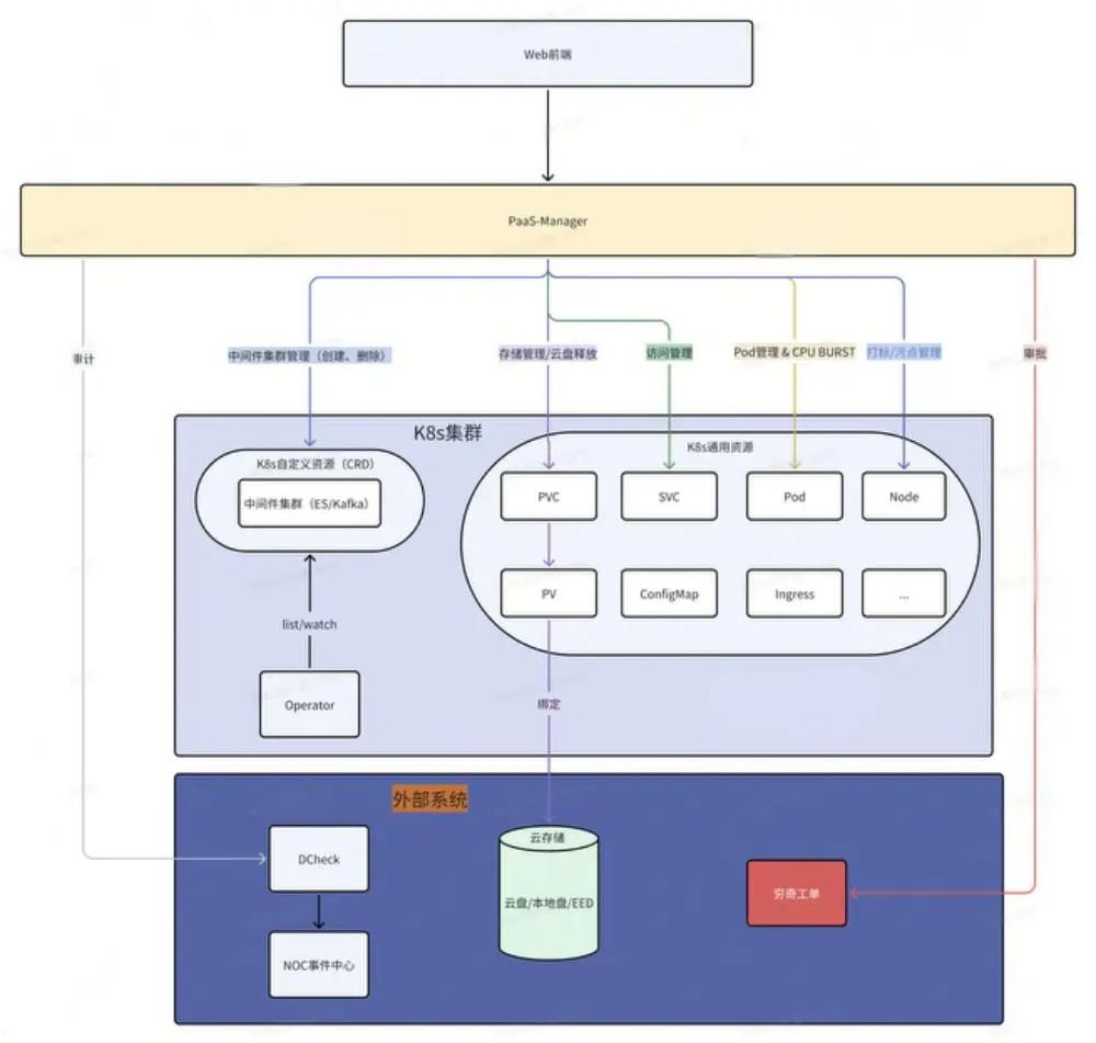 运维标准化与规范化统一运维流程:通过平台白屏化界面,规范了 Kafka、ES、Node、PV、PVC、SVC、Pod 等核心运维场景,减少了操作流程的随意性。最佳实践沉淀:在每个运维场景中,平台积累并固化了标准化的运维流程与策略,降低了运维操作的失误率。减少人为依赖:降低了对资深运维人员的依赖,新手 SRE 也可以在平台指引下完成复杂运维操作。运维效率显著提升操作效率: Node 打标与污点管理从 1小时+ 缩短至 3分钟。 PV 云盘释放从 15分钟+ 缩短至 1分钟。高效应急响应:在 CPU Burst 管理的支持下,有效缓解高并发场景下的 CPU受限和CPU使用率瓶颈问题,保障业务连续性。批量化管理:支持 Node、PV、PVC、SVC、Pod等资源的批量管理,减少重复性操作,提高资源调度效率。成本优化与资源利用最大化资源回收:累计释放 675+ 块闲置云盘,月均节省云成本 15+万元。资源高效分配:通过 Node 筛选与 PV优化管理,有效提升了资源利用率,避免资源浪费。跨云资源托管:统一管理来自不同云厂商的 Kubernetes 集群,避免因平台差异导致的资源闲置。安全性与可审计性提升操作可追溯:所有运维操作均纳入审计日志,累计记录超过 1020+ 条审计日志。合规性保障:平台操作对接 DCheck 系统,实现运维审计和合规性检查。业务稳定性与可扩展性支撑业务高峰:在七夕大促等业务高压场景下,平台有效支撑了中间件的快速扩容和稳定运行。平台可扩展性:架构设计支持快速新增运维场景,满足未来更多资源类型和场景的需求。四、经验总结与反思