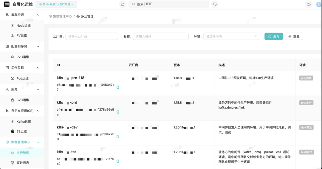 统一托管来自不同云厂商的 Kubernetes 集群,确保多云环境下的资源可视化和统一调度。为大规模中间件部署提供基础支撑,保障平台跨云高可用性。中间件运维服务
