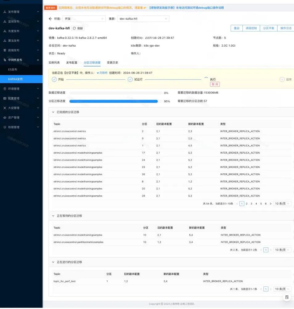 打开平台:登录运维平台,进入 Kafka 集群运维界面。点击扩容:输入副本数,点击 “一键扩容”。实时监控:平台自动执行扩容,Pod 状态、资源分配、数据迁移一目了然。完成审计:所有操作都记录在日志中,可随时回溯。“10 分钟,Kafka 扩容完成,小卡又可以安心地回床上睡觉了。”,如下图: